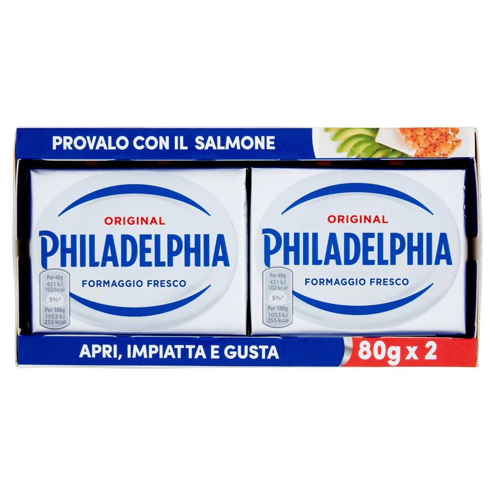 Formaggio spalmabile Philadelphia classico, confezione doppia da 80 grammi ciascuna. Il formaggio spalmabile più famoso al mondo, perfetto per farcire bagel, preparare cheesecake, arricchire salse o semplicemente da spalmare su pane e crackers. La consistenza cremosa e il sapore delicato lo rendono versatile per preparazioni dolci e salate. Formato monoporzione pratico ideale per portare pranzo al lavoro o a scuola.